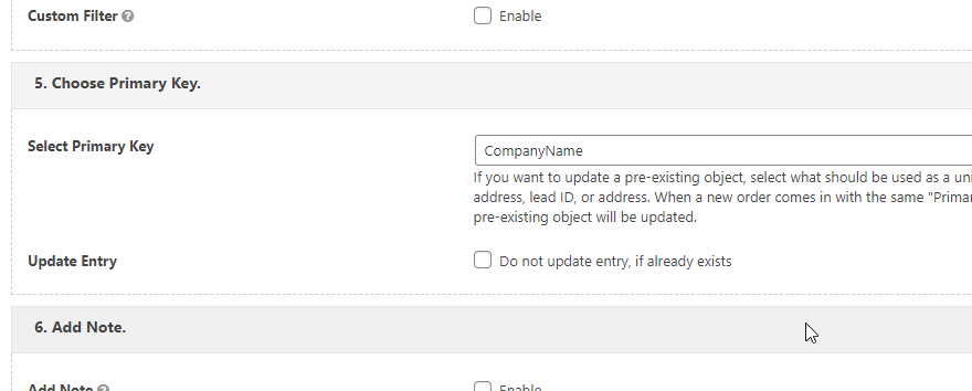 Create a Company feed and map wordpress fields to Infusionsoft fields. Set “CompanyName” as Primary for preventing duplicates.